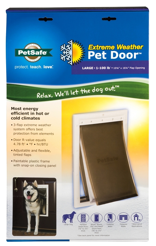 Most energy efficient in hot or cold climates. 3-flap extreme weather system offers best protection from elements. Adjustable and flexible, tinted flaps. For wood, storm, PVC, paneled and metal doors from 1-5/8″ to 2-1/4″ thick. Paintable plastic frame with snap-on closing panel.