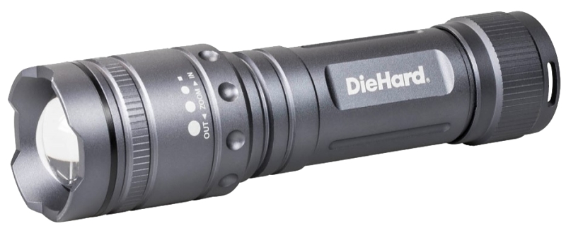 Features durable Pro Grade anodized aluminum construction for a quality feel and finish. With impact and water resistant design, rubber booted tail cap switch, and a heavy duty, non-slip True Grip handle. Twist focus technology from a spot to flood beam, and any point in between. Light settings of high, medium, and low. A flash setting is also included for safety. Stands on its end for hands free lighting. 2 hours and 15 minutes of run time on 6 AA batteries and a 266 meter beam distance. Includes six premium DieHard AA batteries.