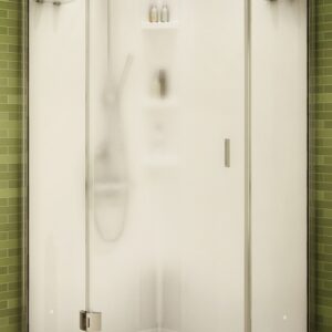 Neoangle shower stall kit. 3-piece white polystyrene wall with 3 shelves, textured base, easy to clean, silicone free, right or left installation pivot door, pebble tempered glass panels, chrome finish frame. 36″ x 36″ x 72″. One year warranty.