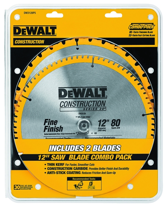 Thin kerf saw blade for use with miter saws and table saws. Includes 2 blades, both 12″ diameter, 1″ round arbor, alternate top bevel, .097″ kerf. No.DW3123 (SKU 656.4629) -5 degree hook angle, 32 teeth, general purpose blade for all-purpose cutting in natural wood, plywood and wood composites. No.DW3128 (SKU 678.1306) -5 degree hook angle, 80 teeth, fine crosscut blade for fine crosscuts in natural wood, plywood and wood composites.