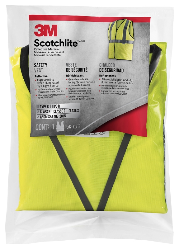 3M™ TEKK Protection™ construction safety vest, used for road work, construction, crossing guards and more is available in fluorescent yellow with 2 in 3M™ Scotchlite™ reflective material 8906 silver fabric trim making it the wearer visible from 360 deg during the day and at night. The lightweight, breathable mesh construction and adjustable straps help ensure that the vest is comfortable and customizable. The five point tear away system makes it easy to remove in an emergency situation while the two large interior pockets provide the wearer with portable storage. It also meets ANSI/ISEA 107-2010 class 2 and federal highway mandate 2009 manual of uniform and traffic control devices. 3M™ TEKK Protection™ construction safety vest is great choice in high-visibility, reflective clothing for professional.