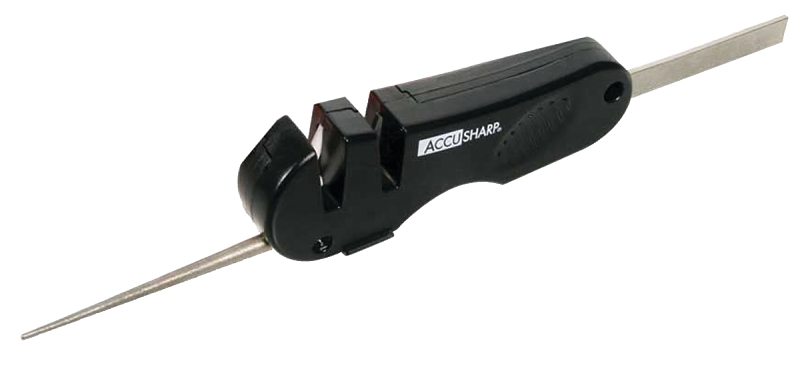 The Accusharp 4-in-1 knife and tool sharpener combines every sharpening necessity into one pocket-sized unit. Featuring coarse tungsten carbide sharpening blades and fine ceramic rods, the unit also comes with a retractable diamond-tapered rod used for deep serrations. The rod also has a groove for all of your hooks and darts. Plus, the unit comes with a retractable flat diamond file for users who prefer a continuous surface for their sharpening needs. The model is finished off with molded rubber feet to keep the unit steady while in use.