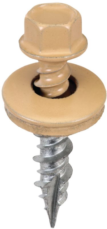 #9-15 Metal-to-wood screws are sealing self-piercing tapping screws made from heat treated Steel, case hardened for roofing and siding applications. A 1/4 in across flats high hat hex washer head with assembled EPDM washer offers easy driving and conforms to the metal surface for a secure and long-lasting seal. The twin lead type 17 point and hi-lo threads offer faster drive time and greater resistance to pullout. All screws are 1000 hr salt spray test dacro-coated. Colored screws are powder-coated over the dacro base coating. All Acorn International screws are packed 250 pieces in a heavy-duty tear-off resealable bag, UPC-coded and retail ready. All bag and carton labels are trilingual. Cartons are heavy-duty cardboard of uniform size and distinctive yellow color for better retail identity.