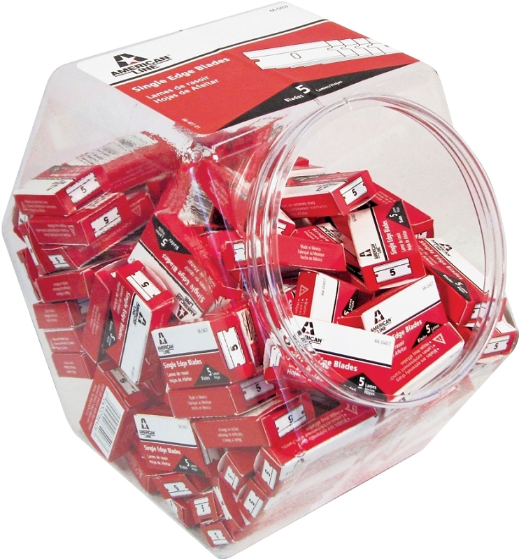 Display contains 100 UPC-coded tucks of 5’s per sealed, reshippable tub. 0.009 in high-carbon surgical steel, single edge blades each protected in shelling paper.
