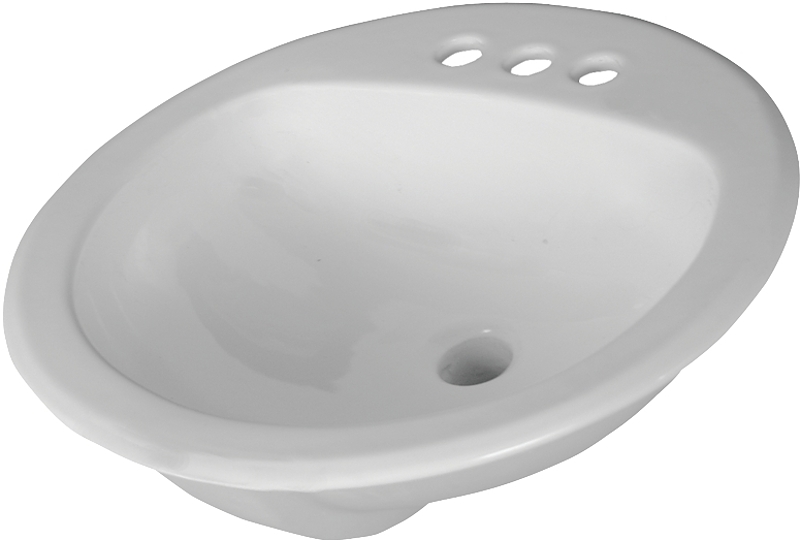 4 in center set. 19 in self-rimming round basin and front overflow. Basin of size 15 in x12 in Supplied with cut out template. Faucets not included.