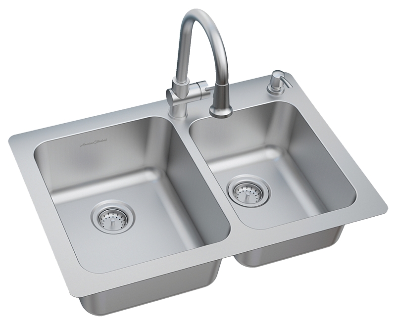 The Montvale 33 x 22 in stainless steel kitchen sink kit comes complete with strainer and an expertly coordinated durable pull-down kitchen sink faucet. Made of sturdy 18 gauge stainless steel, this sink includes two bowls for easy washing and rinsing in daily use.