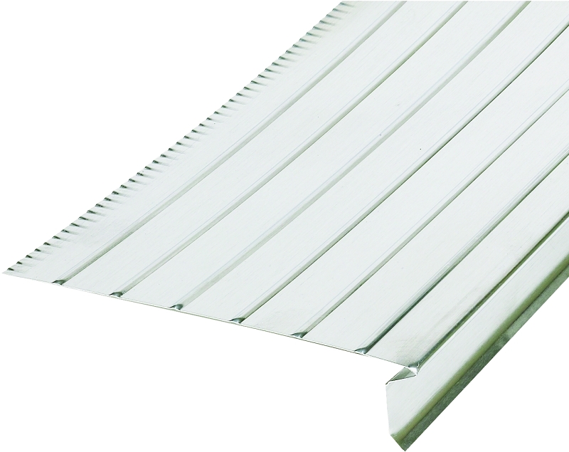 Adds support to shingle when they are extended over roof’s edge. The face, with its kickout at the bottom, diverts rain water from the fascia board helping to eliminate rot. Standard gauge. 5/8 in overhang, throw out included in face size. 6 in x 10 ft to 1 in FACE.