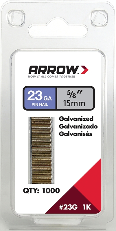 Arrow 23G15-1K Pin Nail, 5/8 in L, 23 Gauge, Galvanized Steel, Round Shank