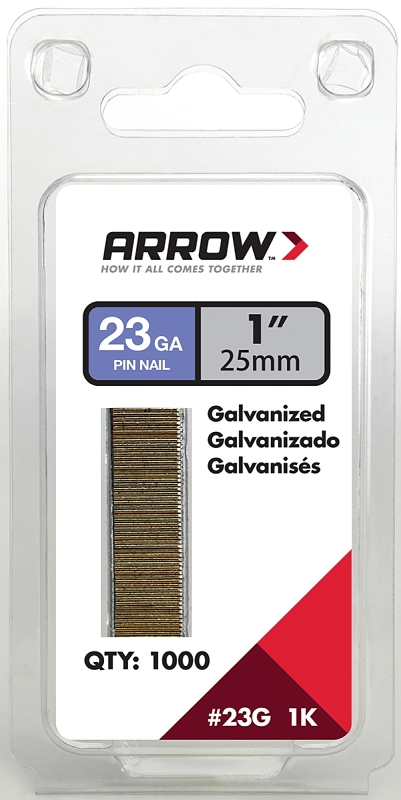 Arrow 23G25-1K Pin Nail, 1 in L, 23 Gauge, Galvanized Steel, Round Shank