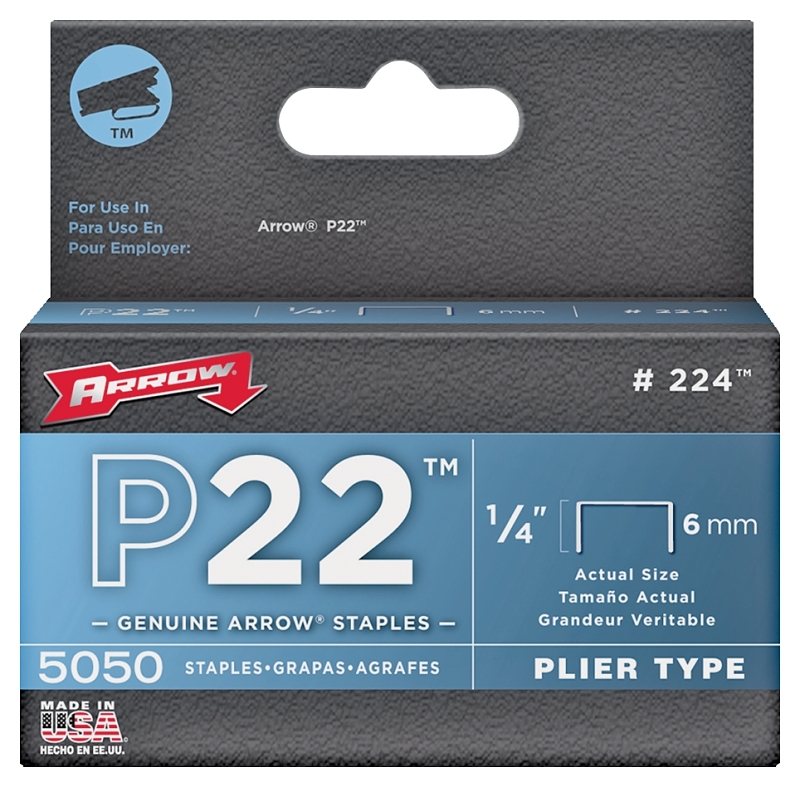 Designed specifically for stapling paper, P22 staples are used on desktops and counters in restaurants, dry cleaners, floral shops, schools and homes around the world. The P22 staple is specially designed to fit the Arrow P22 plier stapler and is great for use on bags, tags, papers and labels. Available in two leg lengths and proudly made in the USA, the P22 staple makes everyday paper fastening a breeze.