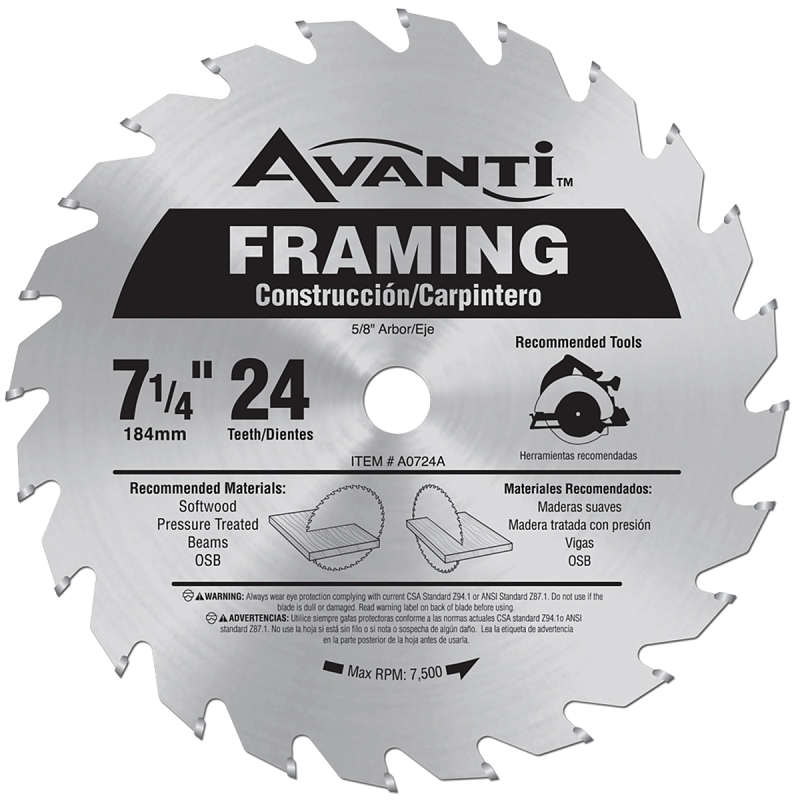 Avanti A0724A Circular Saw Blade, 7-1/4 in Dia, 5/8 in Arbor, 24-Teeth, Carbide Cutting Edge