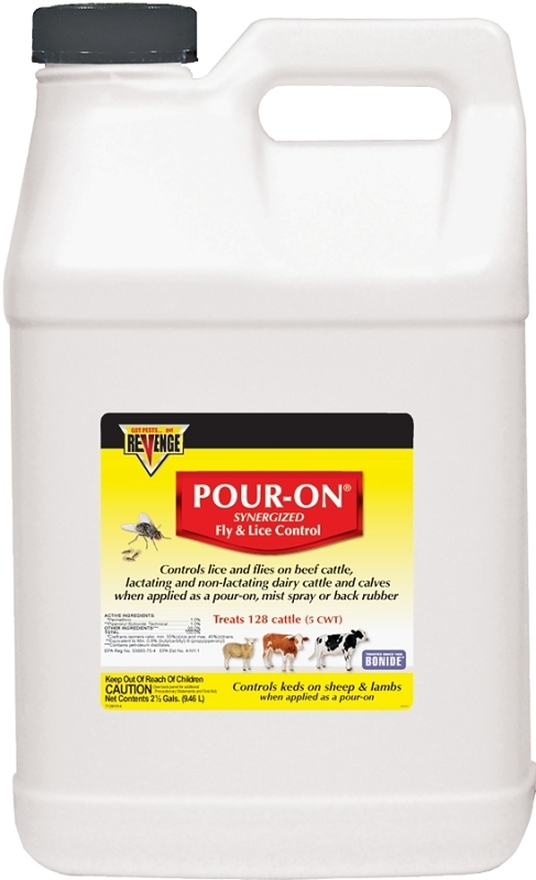 REVENGE® Pour-On™ Fly Control is formulated for listed livestock. Control lice & flies on beef & dairy cattle, calves, sheep, lambs, and other listed animals. Can be used as a pour-on, mist spray, or back rubber.