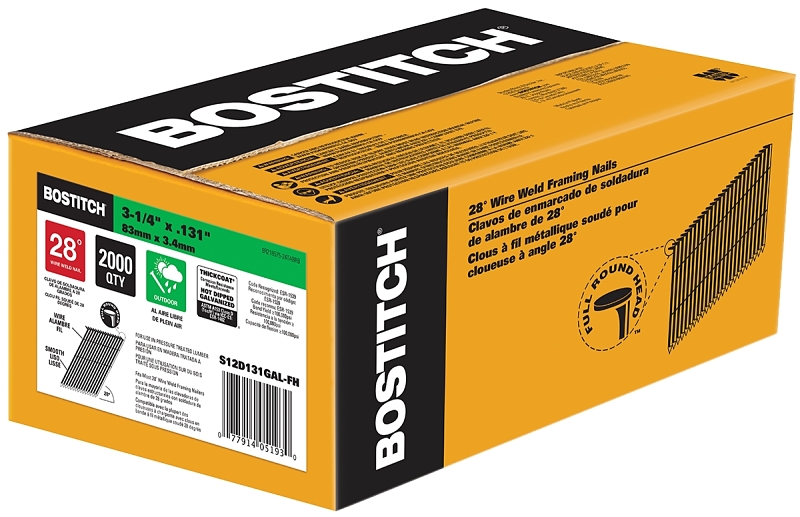 Bostitch Framing Nail, Collation Type: Wire Weld Stick, Collation Angle: 28 deg, Head Type: Full Round, Point Type: Diamond, Shank Type: Smooth, 0.131 in Dia, 3-1/4 in L, Steel, Hot-Dipped Galvanized, Suitable for: Bostitch N79WW, N80SB, N86S, N88WB, N100S, F28WW, GF28WW, BCF28WW, BTF23WW, DeWALT DWF83WW, Max SN883CH/28, Grip-Rite GRTFW83, Hitachi NR90AF(S) Nailers