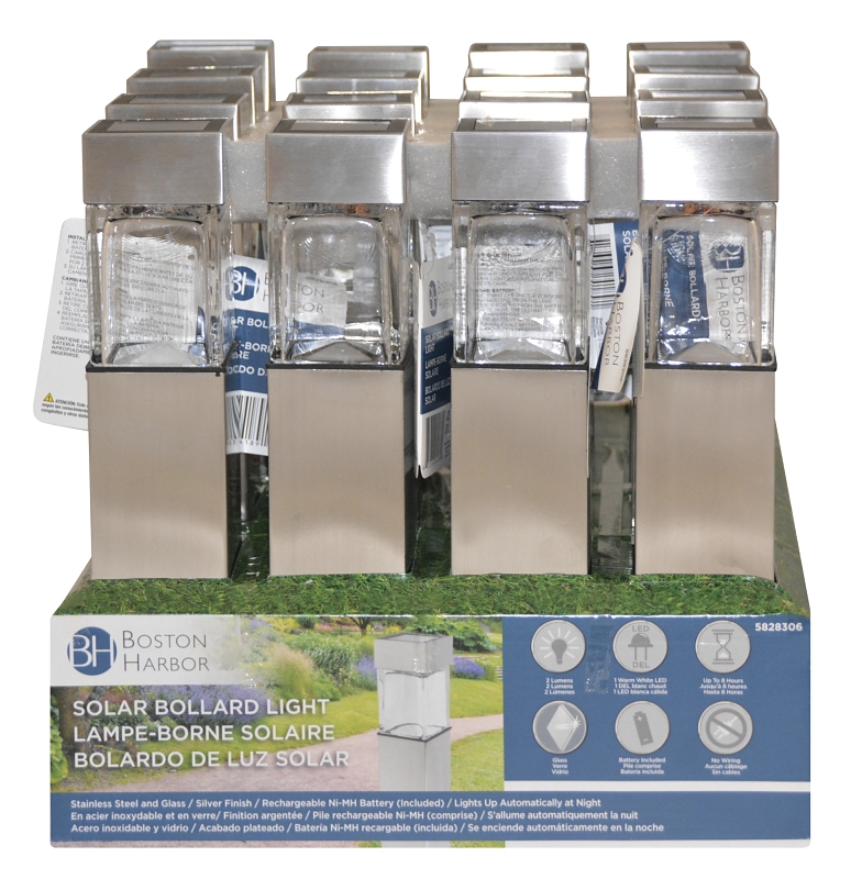 Boston Harbor Square Bollard Path Stake Lights, Solar, Run Time: 8 hr, Battery Included: Yes, Battery Size: AA, Battery Type: Ni-MH, Number of Lamps: 1, Lamp Type: LED, Color Rendering Index (CRI): Stainless Steel, Lumens: 2, Light Color: Warm White, Dusk-to-Dawn Sensor: Yes, Fixture Material: Stainless Steel and Glass, Stainless Steel, Dimensions: 2.26 x 2.26 x 14.96 in