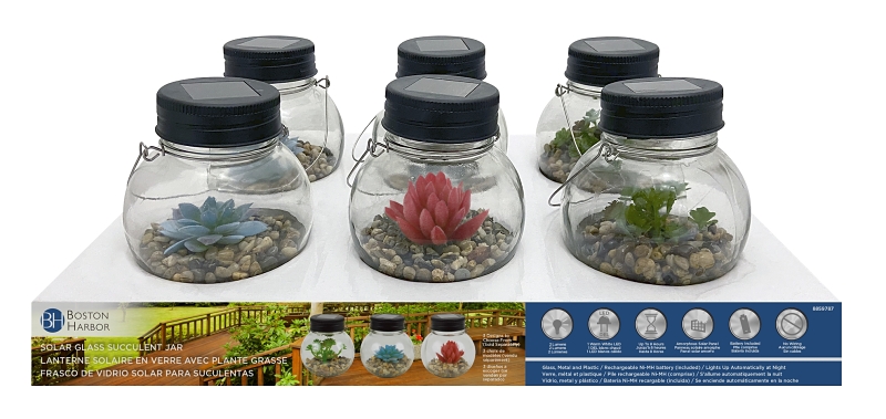 The solar jar light has a succulent plant inside a glass jar, flat black top and SS handle. It’s perfect to place on landscape; ideal for garden, lawn or your patio.