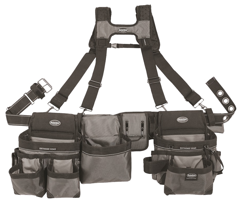 Heavy-duty 1680d poly material. Loadbear stretch suspension for comfort. Speed square pocket, adjustable Velcro pouches and steel buckle belt with monster grommets. Fits waists up to 52 in.