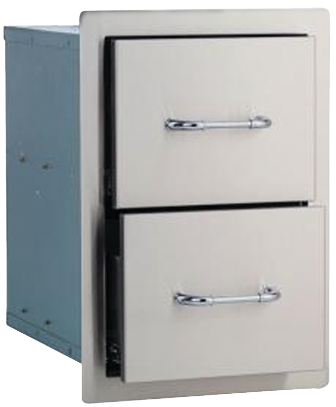 The double drawers have 304 grade 16 ga stainless steel, fully enclosed drawer components for easy storage of grilling accessories and cleaning products.