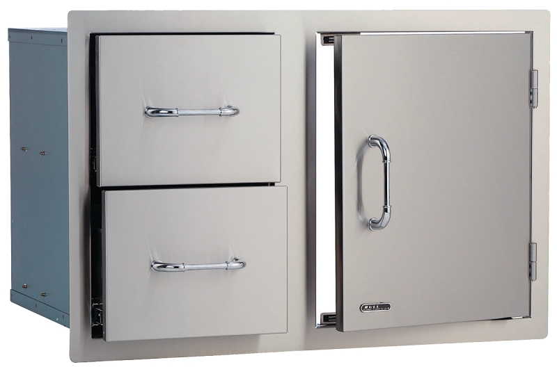 The 30 in door/drawer combo has 304 grade 16 ga stainless steel, fully enclosed drawer components and double lined doors for easy storage of grilling accessories and cleaning products.