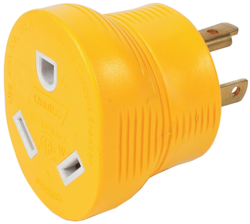 Camco USA RV 30 A generator adapter is intended for connecting to a generator with an L5-30 locking receptacle to a recreational vehicle using a standard 30 A 120 VAC cord set. Adapter has an L5-30 male end and TT-30 female end.