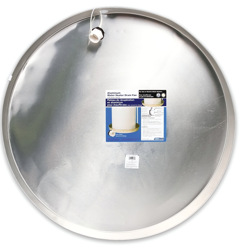 The Camco USA aluminum water heater drain pan has a 32 in I.D and fits underneath gas or electric water heaters to help collect and drain off leaking water. The aluminum pan will not rust or crack and it has a pre-cut hole for the included PVC fitting.