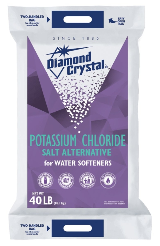 Potassium chloride, salt alternative, for water softeners is a low sodium alternative to traditional water softener salts. Made with up to 99.1% pure potassium chloride, these crystals contain low insoluble content to keep your water softener running smoothly. Diamond Crystal® water softener potassium chloride is recommended for all kinds of water softeners. Potassium chloride works in water softeners the same way that traditional water softener salt (sodium chloride) does, by replacing hard water minerals. The primary difference is that hard water minerals are replaced with potassium instead of sodium.