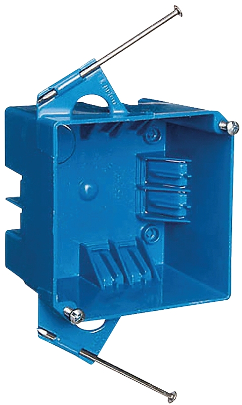 Carlon Outlet Box, Knockout Cable Entry, 2 Gangs, Square Shape, 32 cu-in, Dimensions: 4 in L x 4 in W, Thermoplastic, Blue, 90 deg C, Captive Nail Mounting