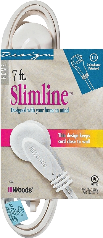 Indoor only, household cord. Thin male plug keeps cord close to wall. Plug does not block other outlets. 13 A/125 V. UL Listed. Sleeved.