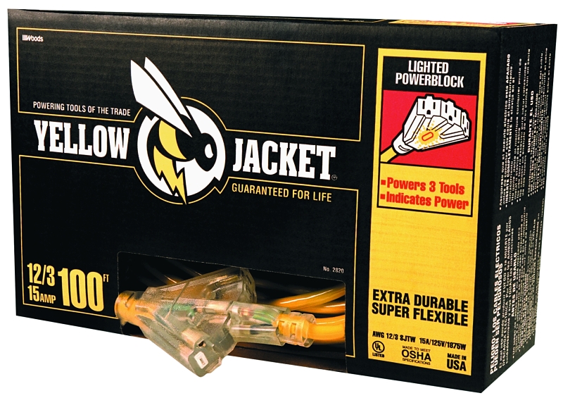 CCI 2820 Power Block, 100 ft L, 3 -Outlet, 15 A, 125 V, Yellow Sheath