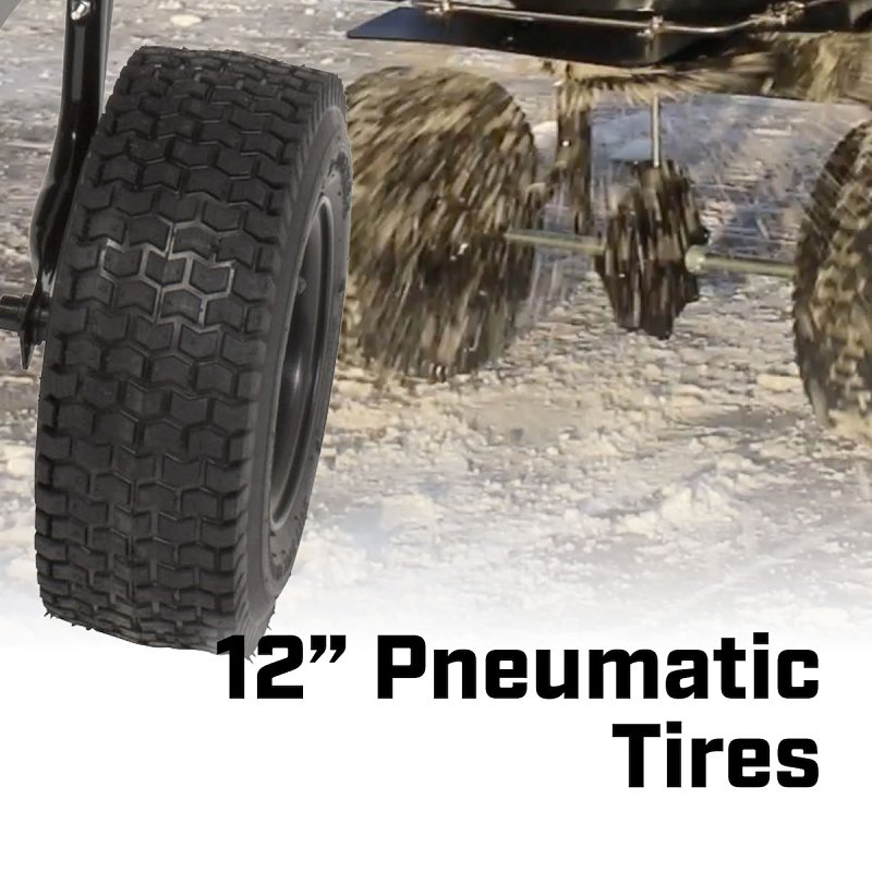 CHAPIN professional spreaders were built to provide all of the features and functionality needed for reliable, efficient performance. The 80 lb professional spreader has a large, 2-piece hopper design, rugged powder-coated steel frame for full hopper support, T-handle with rubber grips, solid linkage gate control, adjustable slide gate, spiked auger to agitate material and tear through clumps, front and side baffle system for directional control of spread pattern, enclosed metal gears, and 12 in wide pneumatic tires for heavy-duty use. Snow/rain cover and salt grate are also included.