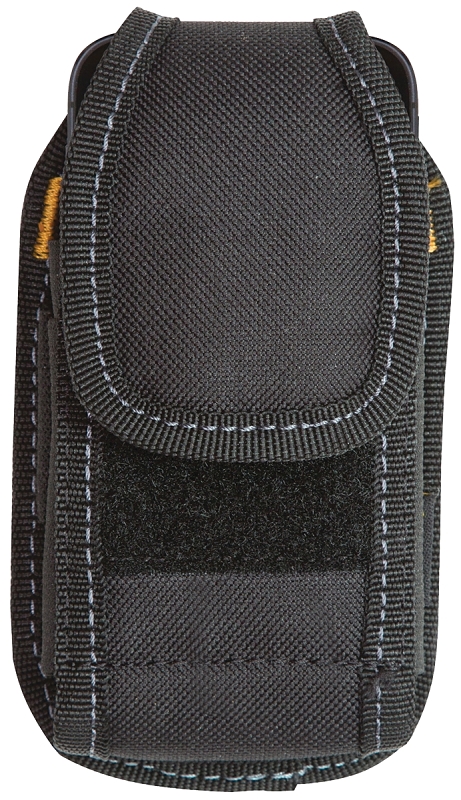 A excellent quality, larger-size cell phone holder with scratch-resistant fabric lining, has an elastic side loop and sleeves to hold a pen/pencil/marker, hook-and-loop closure and heavy-duty clip to attach to a belt or strap or slot for belt.