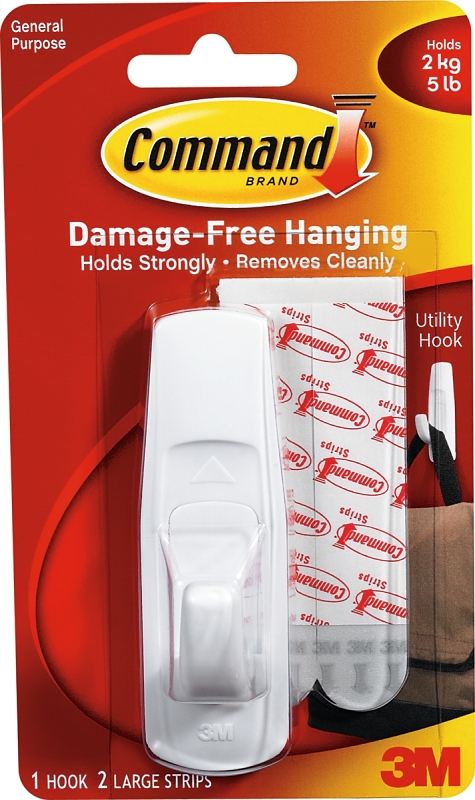 For closets, lockers, offices, kitchens, laundry rooms, mud rooms, kids’ rooms, dorm rooms, baths, boats and campers. Holds objects such as clothes, rags, cleaning items and more. Easy and clean removal of adhesive without leaving sticky or oily residue and with no surface damage. Reusable with Command adhesive replacement strips. Holds up to 5 lb.