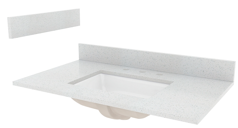 Add a new elegance to your bathroom with a gorgeous new granite vanity top. The silver crystal engineered stone vanity top features pre-attached large rectangular white vitreous china trough bowl and standard edge profile. Ideal addition to an old vanity needing an update, or a new vanity, this vanity top will polish off any bathroom.