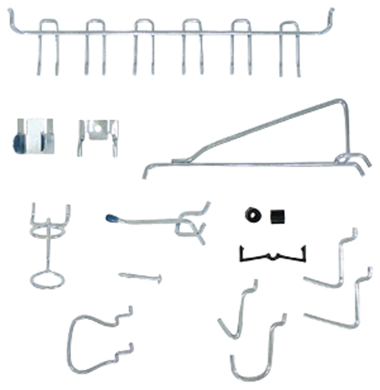 For 1/8 in and 1/4 in pegboard. Includes pegboard mounting screws, double prong straight hooks, mounting spacers, shelf brackets, 1 in straight hooks, 1-1/2 in straight hooks, 1/4 in curved hooks, 1 in curved hooks, 2 in double prong straight hooks, 6 in shelf brackets, grip clips, pliers holders, tool holders, peg locks and multi-tool rack.