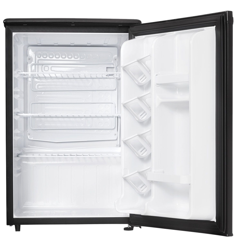 The energy efficient Danby Designer® compact all-fridge has a capacity of 2.6 cu-ft providing ample space for one. At just over 2 ft tall this model can be placed on a countertop or floor and makes a great addition to the dorm room. It includes our second generation CanStor® beverage dispenser, tall bottle storage and our scratch-resistant worktop to store accessories.