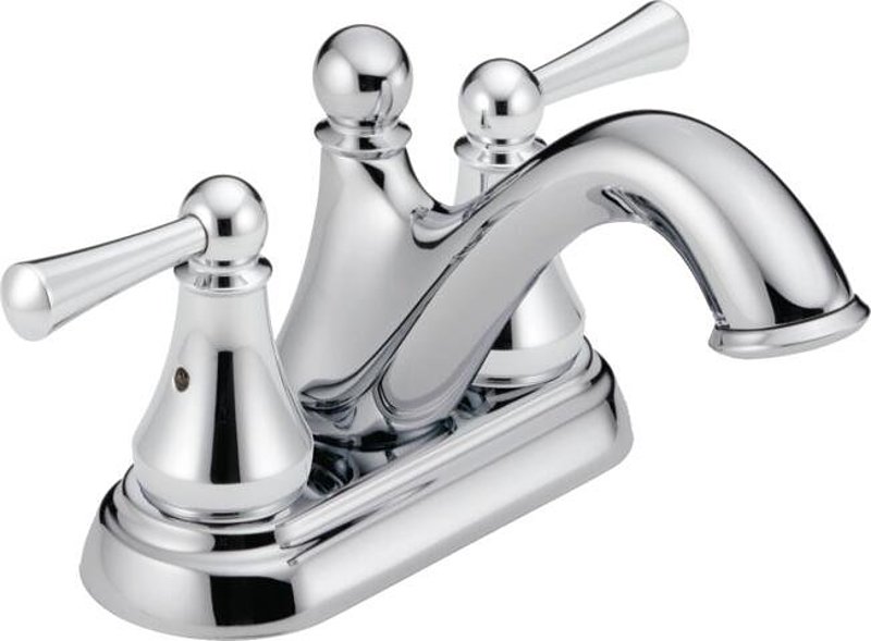 Delta Haywood Bathroom Faucet, 1/2 in Connection, NPSM Connection, 1.2 gpm, 60 psi, Deck Plate Size: 1-3/8 in, Spout Type: Rigid, Spout Reach: 5-1/16 in, Spout Height: 3 in, Lever Handle, Number of Faucet Handles: 2, Brass, Chrome Plated, Number of Faucet Holes: 3, Faucet Centers: 4 in, Faucet Hole Size: 1-1/8 to 1-1/2 in, Dimensions: 4-11/16 in H x 9-5/16 in W, Includes: Plastic Pop-Up Drain Assembly