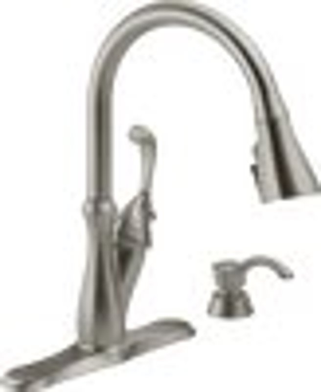 Delta Arabella Kitchen Faucet, 3/8 in Connection, 1.8 gpm, 60 psi, Deck Plate Size: 10 in, Deck Thickness: 2-1/2 in, Spout Type: High Arc, Spout Reach: 9-13/64 in, Spout Height: 8-5/8 in, Lever Handle, Metal, Stainless, Deck Mounting, Faucet Centers: 8 in, Faucet Hole Size: 1-3/8 in, Dimensions: 15-3/8 in L, Includes: Soap Dispenser
