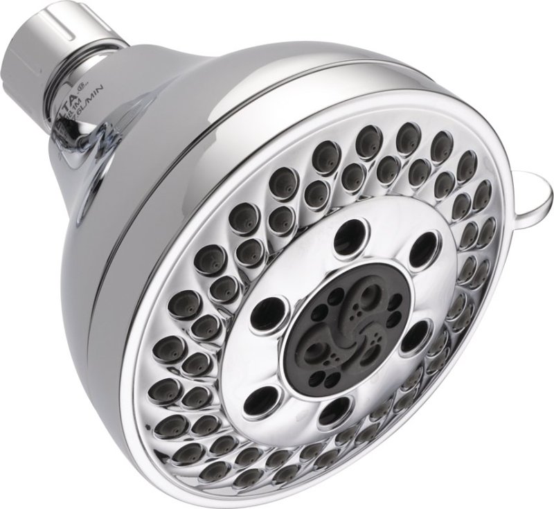 Delta Shower Head, 1.75 gpm, 1/2 in Connection, IPS Connection, Number of Spray Functions: 5, Spray Settings: Full Body Spray, Pause, Massaging Spray, Full Spray with Massage, H2Okinetic Spray, Plastic, Chrome, 4-5/32 in Dia, 4-5/8 in H