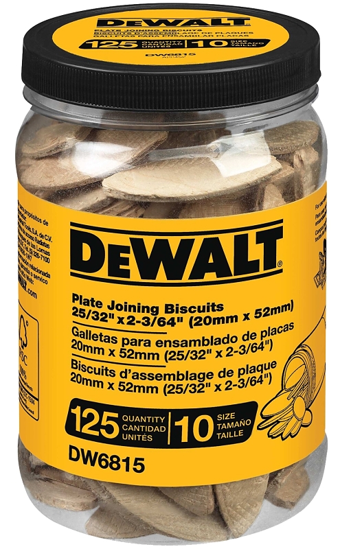 The DW6815 tube of 125 No. 10 size biscuits are manufactured to the highest industry standards with 100% compressed beech to deliver great joint strength.