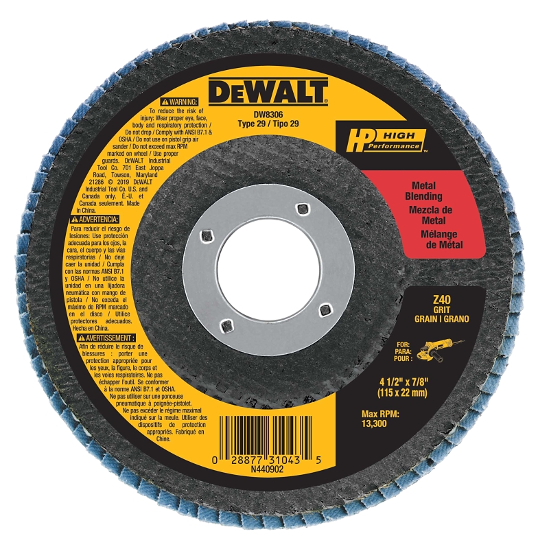 Designed for grinding angles of 20 to 25 deg, DeWALT-type 29 HP flap discs quickly remove material with aggressive grinding action. Featuring zirconia grit, which removes material 3X fast than fiber resin metal sanding discs, each disc is packed with a premium abrasive cloth that lasts 15X long than fiber resin metal sanding discs.