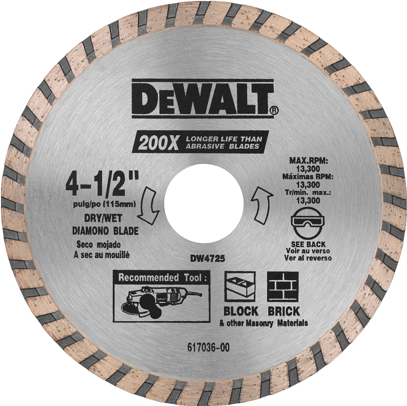 DEWALT DW4725 Circular Blade, 4-1/2 in Dia, 7/8 in Arbor, Diamond Cutting Edge