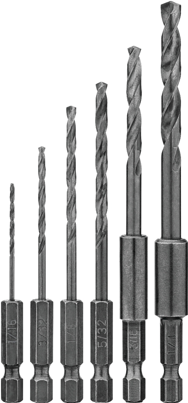 Black oxide coating provides longer life. Split point tips to prevent walking and universal 1/4 in hex shank locking system prevents slipping. Includes: 1/16 in, 3/32 in, 1/8 in, 5/32 in, 3/16 in and 1/4 in.