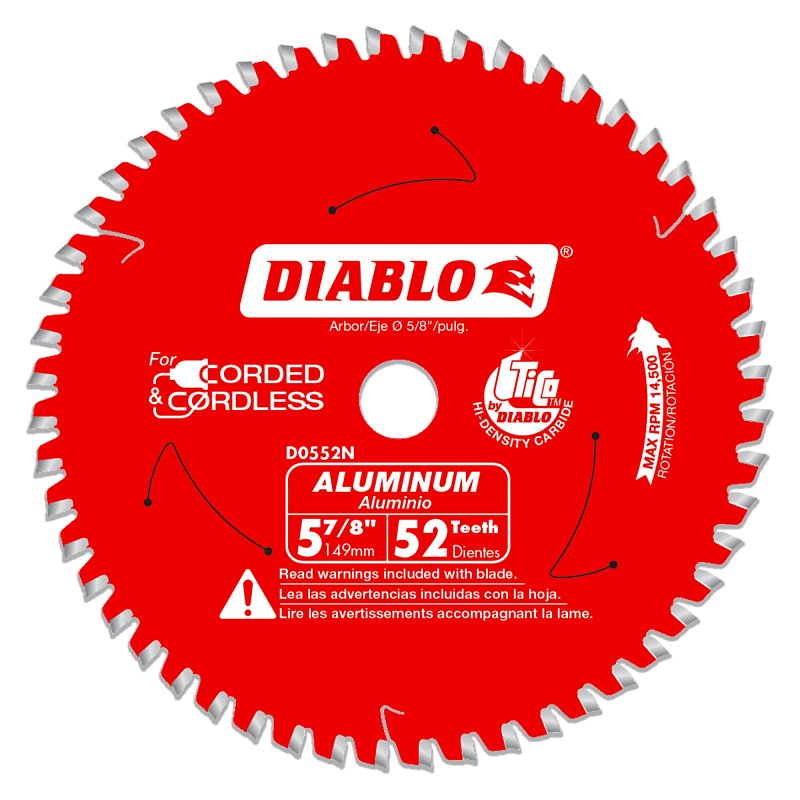 Diablo’s next generation Aluminum saw blades are optimized for cutting thin (up to 1/8 in), medium (3/32 to 1/4 in) and thick (3/16 to 7/16 in ) aluminum metals. Featuring the new, specially formulated Diablo Tico™ super density micro grain Carbide, these radical blades withstand impact, reduce wear, provide clog-free cuts and lasts longer than standard carbide in metal cutting applications. The specially formulated metal cutting carbide teeth feature a triple chip grind (TCG) tooth design for clean, burr-free finishes, virtually eliminating any-type of rework. Tri-metal shock-resistant brazing allows these aluminum blades to slice through metal materials while withstanding extreme impact for maximum durability. Diablo’s Aluminum saw blade series is ideal for corded and cordless saws when on the-job cutting non-ferrous metals such as aluminum extrusions, copper pipe, brass plate, etc.