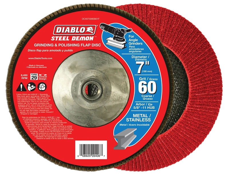 Diablo Steel Demon DCX070060B01F Flap Disc with Hub, 7 in Dia, 5/8-11 Arbor, 60 Grit, Coarse, Zirconia Abrasive