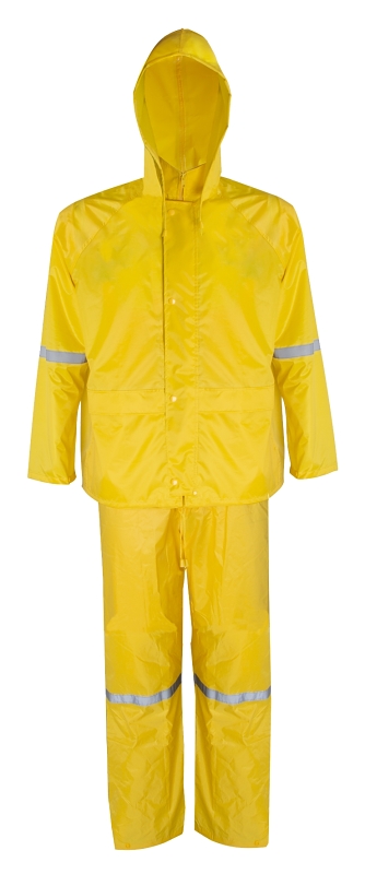 Diamondback Rain Suit, 2XL, Fits to Chest Size: 58 in, Fits to Waist Size: 52 in, Polyester, Yellow, Number of Pockets: 2, Collar Type: Concealed, Sleeve Type: Adjustable Cuffs, Cuff Type: Adjustable, Ankle Type: With Reflective Tape, Seam Type: Stitching, Zipper with Storm Flap Closure, Length Type: Over-Waist, Lining Material: Polyester, Inseam Length: 44 in, 34 in L, Resists: Water, Includes: Grommeted PVC Bag, Insert