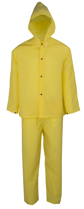 Diamondback Rain Suit, 2XL, Fits to Chest Size: 58 in, Fits to Waist Size: 52 in, EVA, Yellow, Collar Type: Hooded, Sleeve Type: Adjustable Cuffs, Cuff Type: Adjustable, Seam Type: Heal Sealed, Snap Down Storm Flap Closure, Length Type: Over-Waist, Inseam Length: 44 in, 34 in L, Resists: Water, Includes: Grommeted PVC Bag, Insert