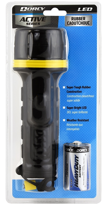 This flashlight is an excellent option for use around the home. It is constructed of tough, easy grip rubber for durability and long lasting life. Other features include a sleek and rugged design for comfortable handling, a non-slip grip, weather resistance and a sealed push-button switch for ease of use. Available in black and includes a convenient nylon lanyard and 1 D cell battery.