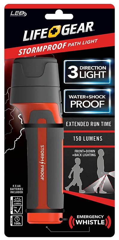 Most lights light the path in front of you. The Stormproof pathlight lights the path in front of you, below you and behind you. In an emergency situation where it is dark and you may be leading others to safety, wouldn’t it be invaluable to have a safety light that lights the path all around you, especially when debris could be everywhere If several people are trying to get to safety, the person in the lead with the flashlight can see, while the others can’t. This light solves that problem and gives you piece of mind in knowing that when an emergency occurs, you’ll be ready and able to light the total patch to safety. Made of waterproof and impact-resistant materials, this light is rugged and ready for anything you can throw at it. It also has an integrated rubber grip which allows you to hold the light comfortably in wet, slippery weather. There is one button for the forward light, while a second button controls the downward and backward beams, giving you added flexibility. The Stormproof pathlight has 330 Lumens of power on high and 15 Lumens on low, so you’ll always have the right amount of power for your particular needs. With run times of 4.5 hr on high and 75 hr on low, you can be assured that you’ll have light when you need it. Also includes a built in emergency whistle so you can be heard in case of an emergency. Not just for safety and emergencies, this light is also perfect for your next outdoor adventure. Four AA batteries are included.