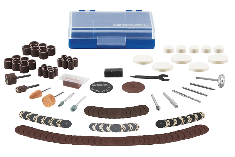 The maker in all of us will appreciate this 130-piece accessory kit because it contains the most popular Dremel rotary tool accessories at a very convenient price. Inside this accessory set are assorted bits for cutting, carving, engraving, grinding, drilling, sharpening, sanding, cleaning and polishing. The kit consists of regular cut off wheels, sanding bands, sandpaper discs, felt polishing wheels, carbon steel brush, aluminum oxide grinding stones, silicon-carbide grinding stones, dressing stone, mandrels, wrench and a reusable storage case.