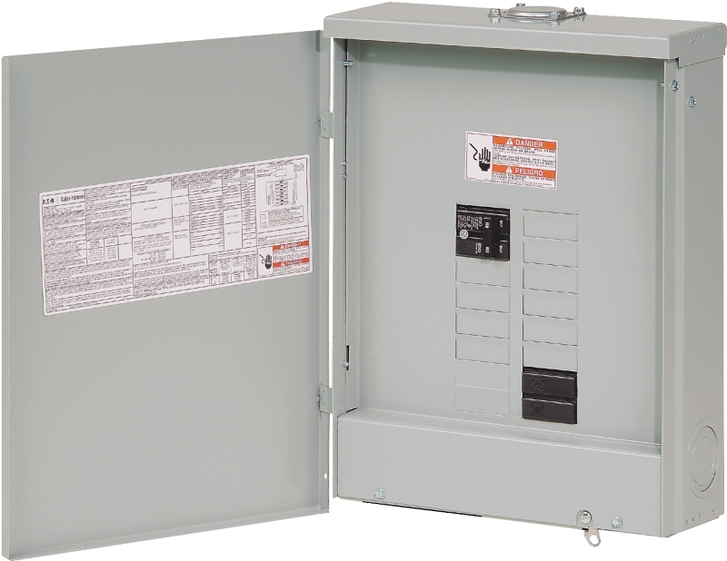 Eaton Load Center, 120/240 V, 100 A, Number of Phases: 1, Number of Spaces: 10, Number of Poles: 20, Number of Circuits: 20, Breaker/Load Center Type: Main Breaker, Plug-On Neutral, Cable Size: #4-1/0 AWG, Bus Bar Material: Aluminum, Bus Bar Rating: 100 A, Enclosure Type: NEMA 3R, Flush, Surface Mounting