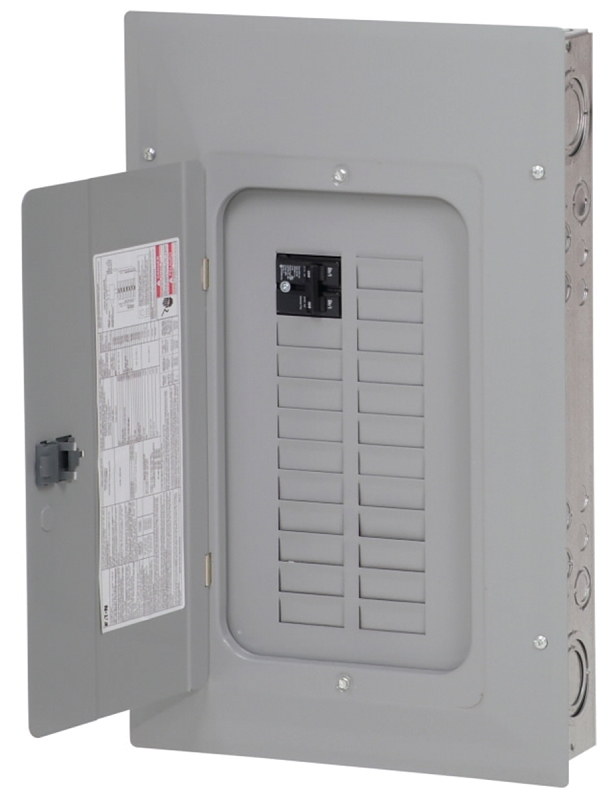 Eaton Load Center, 240 V, 125 A, Number of Spaces: 20, Number of Poles: 1, Number of Circuits: 40, Breaker/Load Center Type: Main Lug, Interrupt Rating: 10 kAIC, Bus Bar Material: Aluminum, Enclosure Type: NEMA 1, Plug Mounting, Metal, Includes: Cover